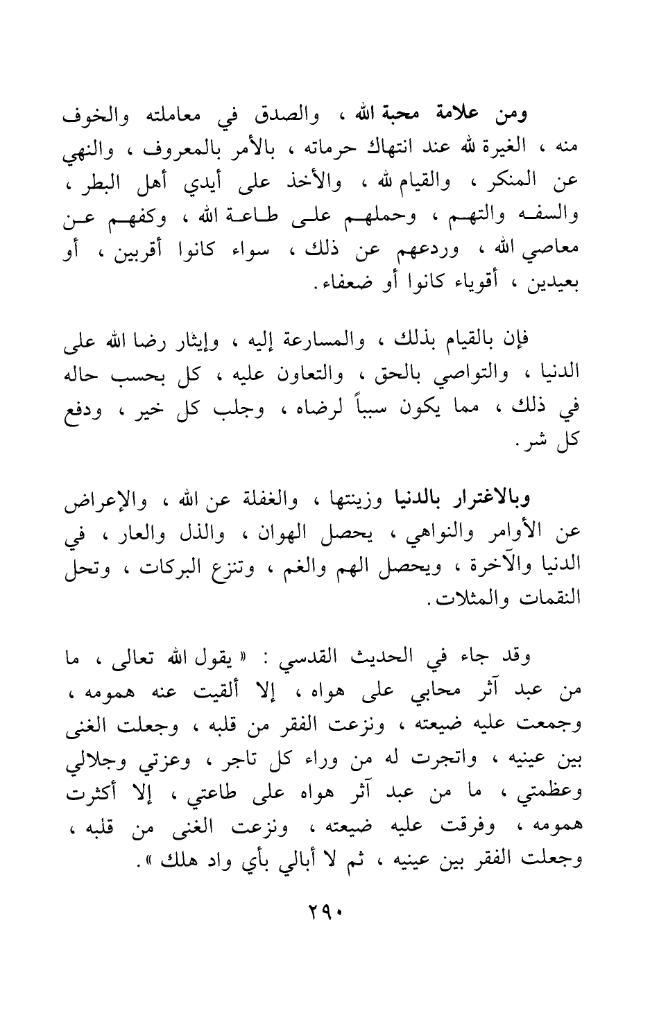 وقد جاء في الحديث القدسي: يقول الله تعالى: ما من عبد آثر محابي على هواه، إلا ألقيت عنه همومه، وجمعت عليه ضيعته، ونزعت الفقر من قلبه، وجعلت الغنى بين عينيه، واتجرت له من وراء كل تاجر. وعزتي وجلالي وعظمتي، ما من عبد آثر هواه على طاعتي، إلا أكثرت همومه، وفرقت عليه ضيعته، ونزعت الغنى من قلبه، وجعلت الفقر بين عينيه، ثم لا أبالي بأي واد هلك.