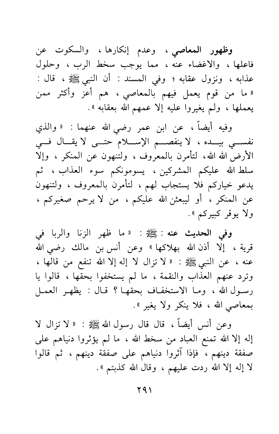 وفي الحديث عنه: صلى الله عليه وسلم ما ظهر الزنى والربا في قرية، إلا أذن الله بهلاكها، وعن أنس بن مالك رضي الله عنه عن النبي صلى الله عليه وسلم: لا تزال لا إله إلا الله تنفع من قالها، وترد عنهم العذاب والنقمة، ما لم يستخفوا بحقها، قالوا: يا رسول الله، وما الاستخفاف بحقها؟ قال: يظهر العمل بمعاصي الله، فلا ينكر ولا يغير.
