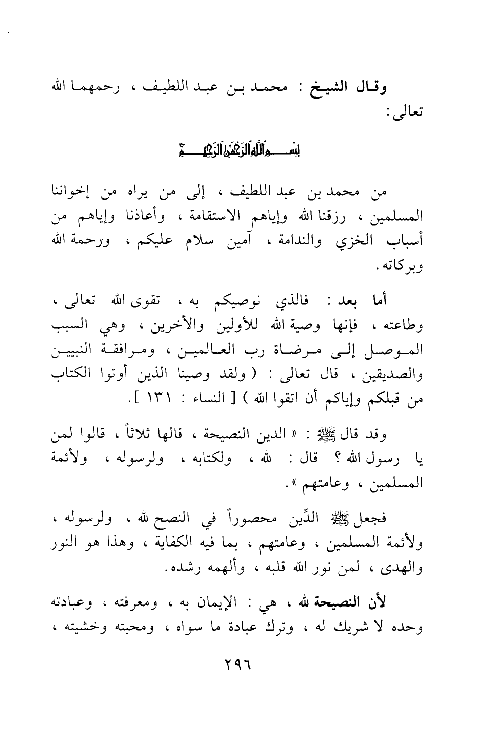 من محمد بن عبد اللطيف، إلى من يراه من إخواننا المسلمين، رزقنا الله وإياهم الاستقامة، وأعاذنا وإياهم من أسباب الخزي والندامة، آمين سلام عليكم، ورحمة الله وبركاته..
