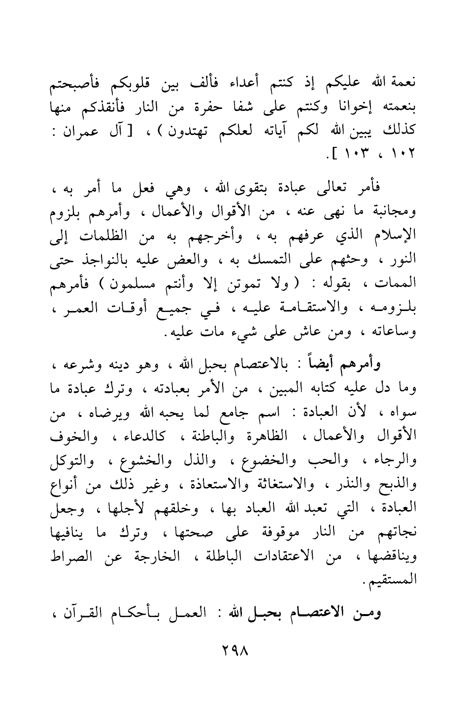 وأمرهم أيضا: بالاعتصام بحبل الله، وهو دينه وشرعه، وما دل عليه كتابه المبين، من الأمر بعبادته، وترك عبادة ما سواه، لأن العبادة: اسم جامع لما يحبه الله ويرضاه، من الأقوال والأعمال الظاهرة والباطنة، كالدعاء، والخوف والرجاء، والحب والخضوع، والذل والخشوع، والتوكل والذبح والنذر، والاستغاثة والاستعاذة، وغير ذلك من أنواع العبادة، التي تعبد الله العباد بها، وخلقهم لأجلها، وجعل نجاتهم من النار موقوفة على صحتها، وترك ما ينافيها ويناقضها، من الاعتقادات الباطلة الخارجة عن الصراط المستقيم.