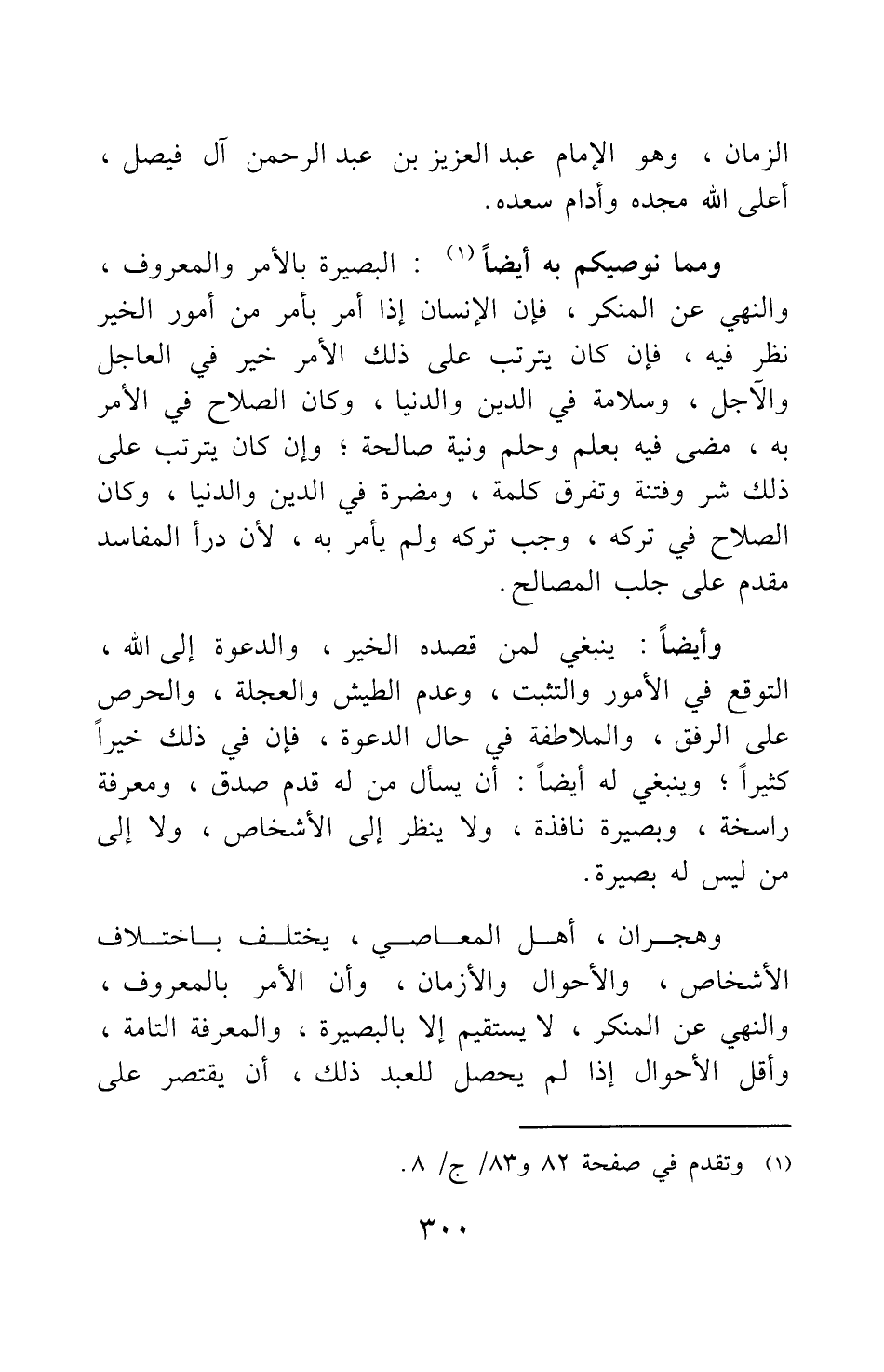 ومما نوصيكم به أيضا 1: البصيرة بالأمر بالمعروف والنهي عن المنكر، فإن الإنسان إذا أمر بأمر من أمور الخير نظر فيه، فإن كان يترتب على ذلك الأمر خير في العاجل والآجل، وسلامة في الدين والدنيا، وكان الصلاح في الأمر به، مضى فيه بعلم وحلم ونية صالحة; وإن كان يترتب على ذلك شر وفتنة وتفرق كلمة، ومضرة في الدين والدنيا، وكان الصلاح في تركه، وجب تركه ولم يأمر به، لأن درأ المفاسد مقدم على جلب المصالح.