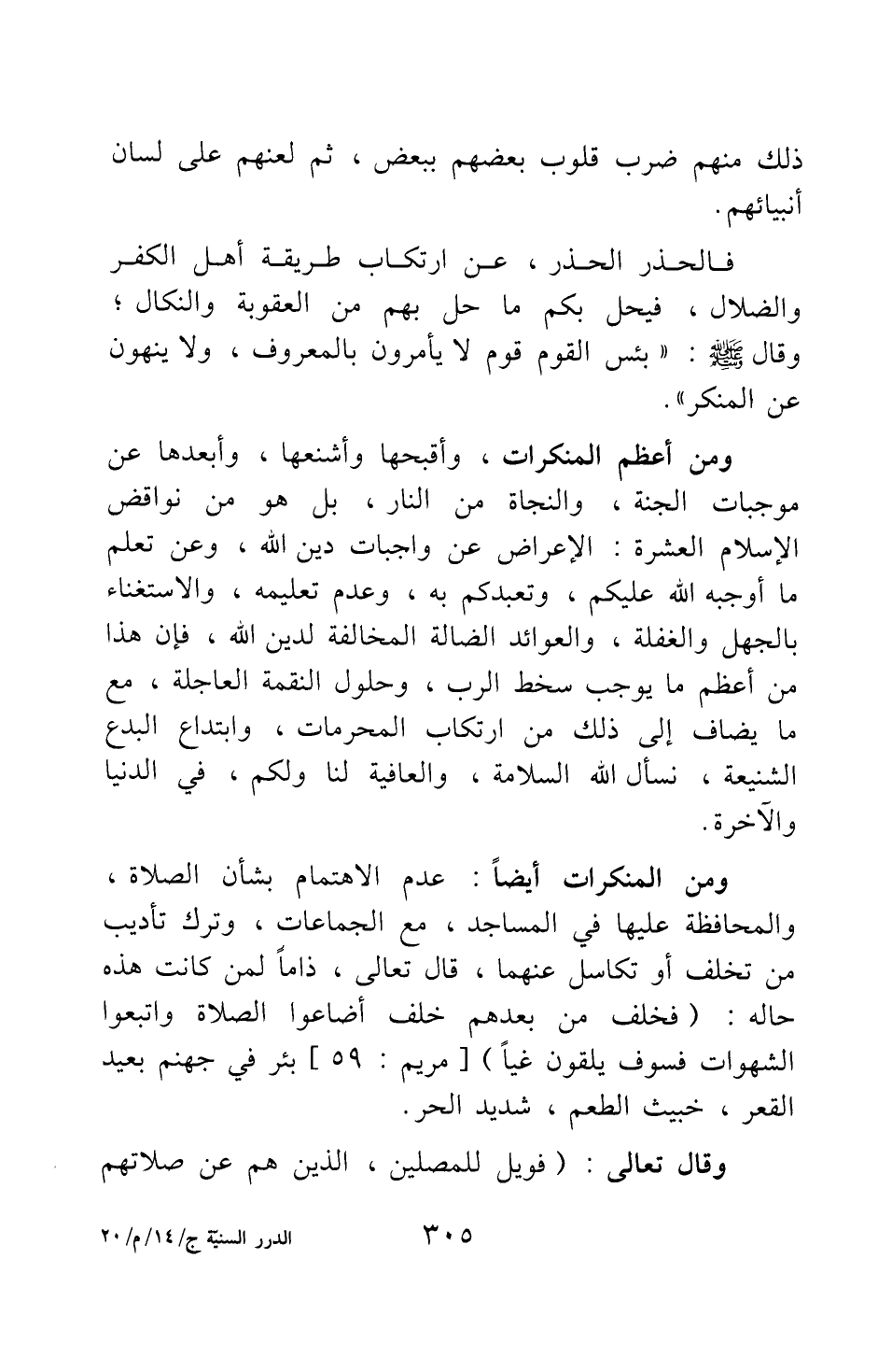 فالحذر الحذر، عن ارتكاب طريقة أهل الكفر والضلال، فيحل بكم ما حل بهم من العقوبة والنكال، وقال صلى الله عليه وسلم: بئس القوم قوم لا يأمرون بالمعروف، ولا ينهون عن المنكر.