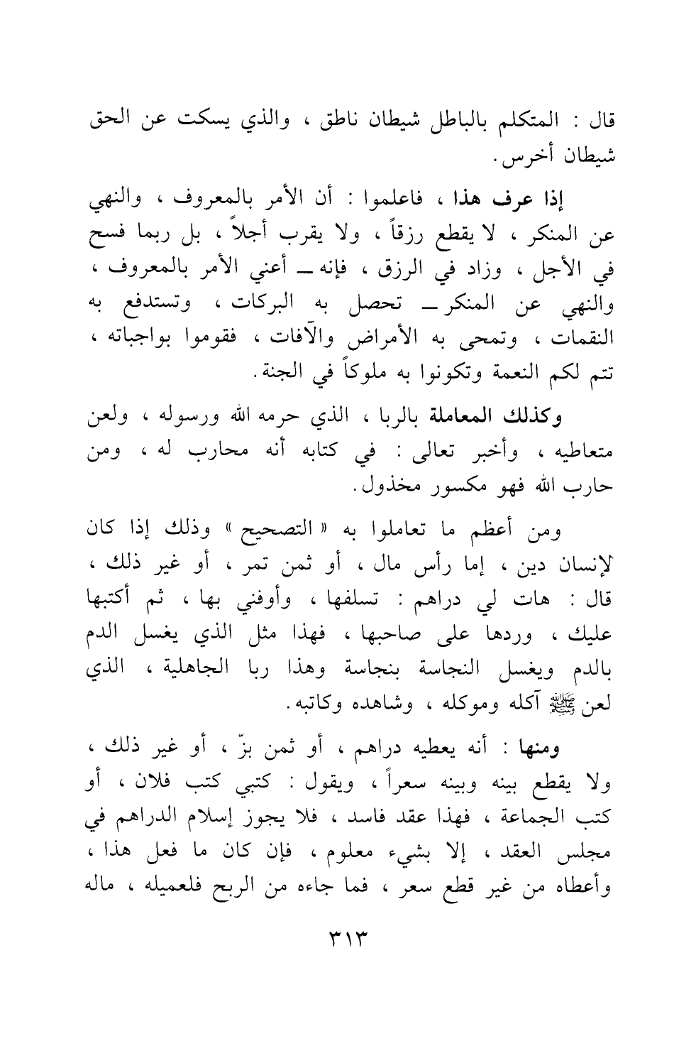 ومن أعظم ما تعاملوا به "التصحيح"، وذلك إذا كان لإنسان ديْن، إما رأس مال، أو ثمن تمر، أو غير ذلك، قال: هات لي دراهم تسلفها، وأوفني بها، تم أكتبها عليك، وردها على صاحبها؛ فهذا مثل الذي يغسل الدم بالدم ويغسل النجاسة بنجاسة؛ وهذا ربا الجاهلية الذي لعن صلى الله عليه وسلم آكله وموكله، وشاهده وكاتبه.