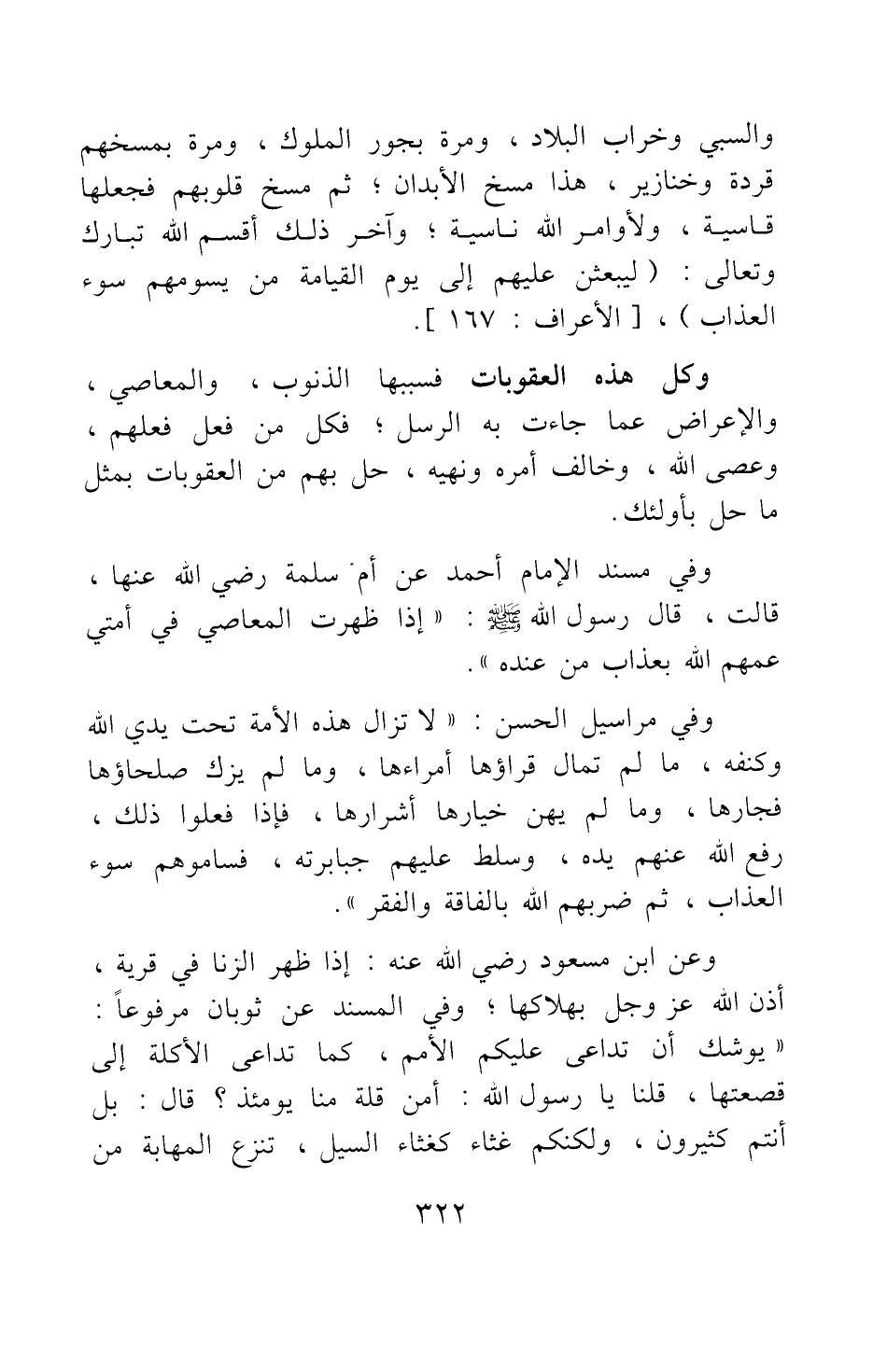 وعن ابن مسعود رضي الله عنه: إذا ظهر الزنى في قرية أذن الله عز وجل بهلاكها وفي المسند عن ثوبان مرفوعا: يوشك أن تداعى عليكم الأمم، كما تداعى الأكلة إلى قصعتها، قلنا: يا رسول الله، أمن قلة منا يومئذ؟ قال: بل أنتم كثيرون، ولكنكم غثاء كغثاء السيل، تنْزع المهابة من