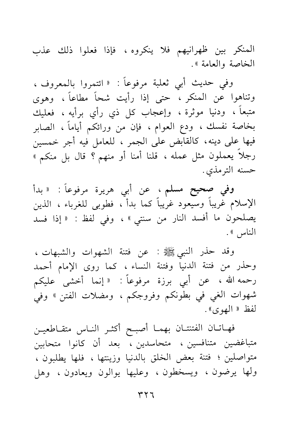 وفي صحيح مسلم، عن أبي هريرة مرفوعا: بدأ الإسلام غريبا وسيعود غريبا كما بدأ، فطوبى للغرباء، الذين يصلحون ما أفسد الناس من سنتي 2 وفي لفظ: إذا فسد الناس.