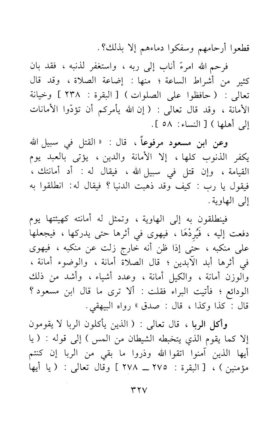 فينطلقون به إلى الهاوية، وتمثل له أمانته كهيئتها يوم دفعت إليه فيردها، فيهوي في أثرها حتى يدركها، فيجعلها على منكبه، حتى إذا ظن أنه خارج زلت عن منكبه، فيهوي في أثرها أبد الآبدين، قال: الصلاة أمانة، والوضوء أمانة، والوزن أمانة، والكيل أمانة، وعدد أشياء، وأشد من ذلك الودائع، فأتيت البراء فقلت: ألا ترى ما قال ابن مسعود؟ قال: كذا وكذا، قال: صدق رواه البيهقي.