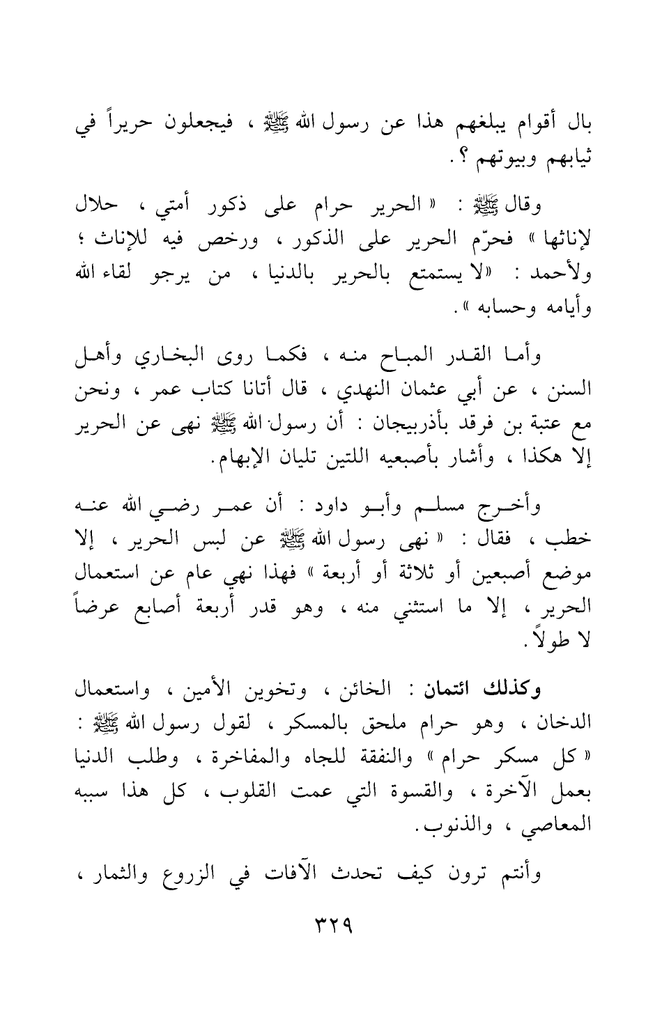 وأخرج مسلم وأبو داود: أن عمر رضي الله عنه خطب، فقال: نهى رسول الله صلى الله عليه وسلم عن لبس الحرير، إلا موضع أصبعين أو ثلاثة أو أربعة 3 فهذا نهي عام عن استعمال الحرير، إلا ما استثني منه، وهو قدر أربعة أصابع عرضا لا طولا.