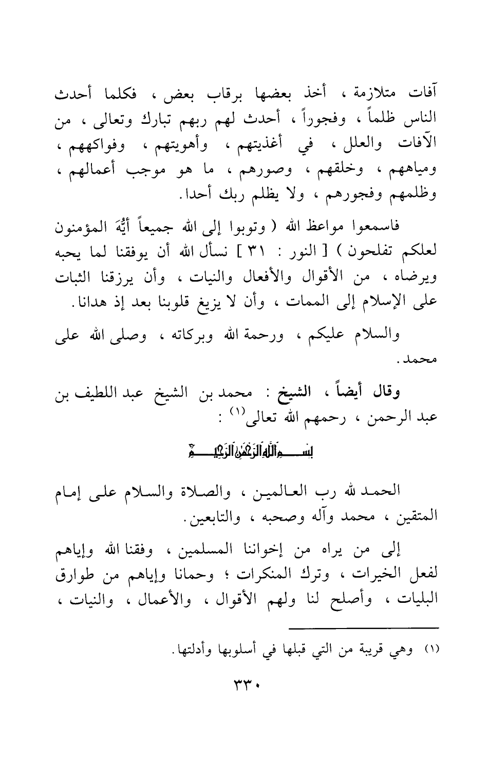 وقال أيضا، الشيخ: محمد بن الشيخ عبد اللطيف بن عبد الرحمن، رحمهم الله تعالى 1.