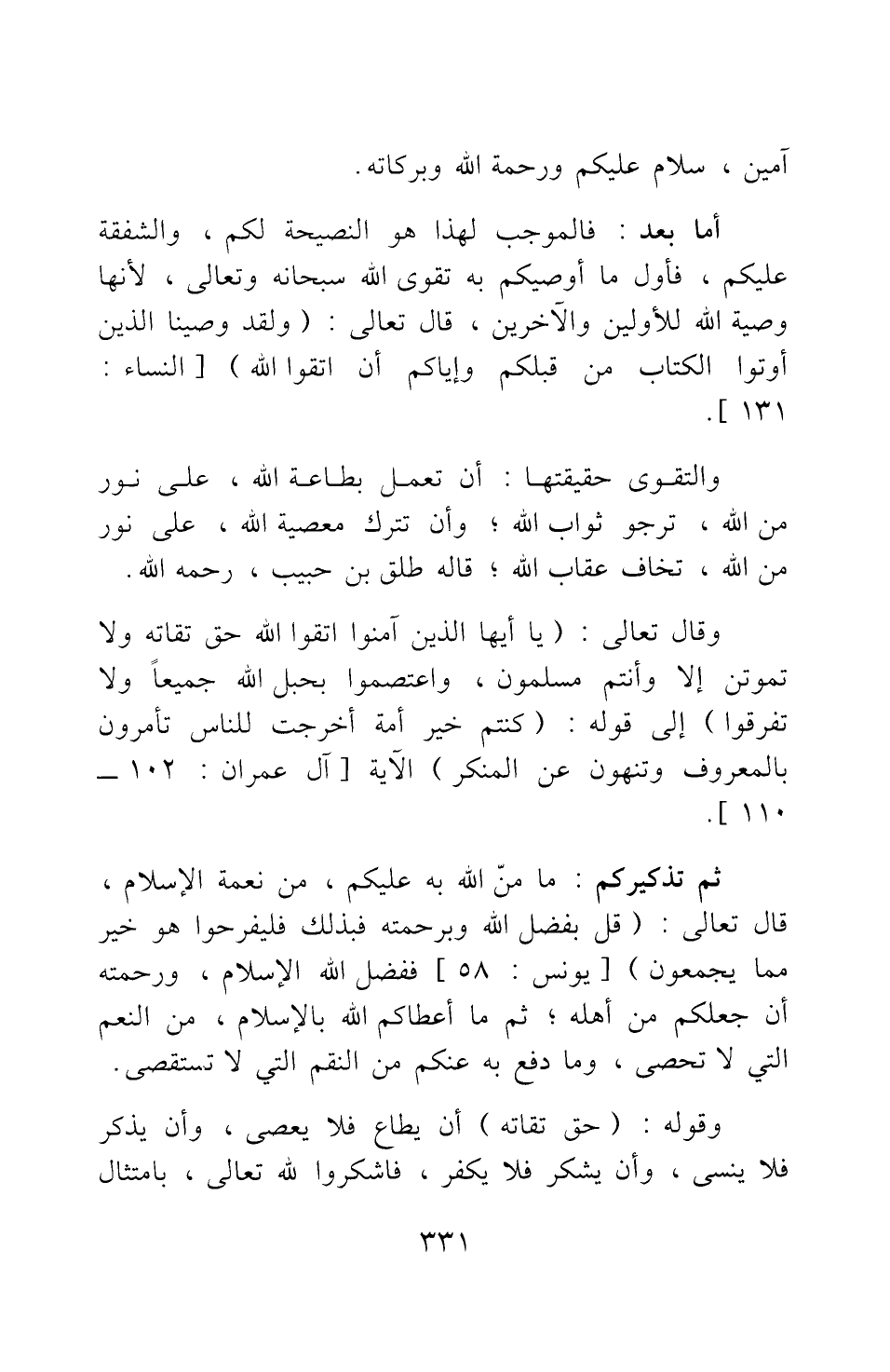 أما بعد: فالموجب لهذا هو النصيحة لكم، والشفقة عليكم، فأول ما أوصيكم به تقوى الله سبحانه وتعالى، لأنها وصية الله للأولين والآخرين، قال تعالى: {وَلَقَدْ وَصَّيْنَا الَّذِينَ أُوتُوا الْكِتَابَ مِنْ قَبْلِكُمْ وَإِيَّاكُمْ أَنِ اتَّقُوا اللَّهَ} [سورة النساء آية: 131] .
