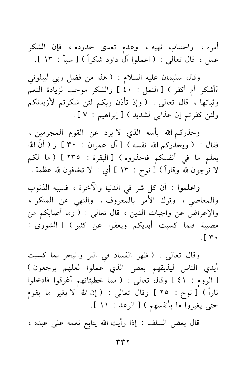 أمره، واجتناب نهيه، وعدم تعدي حدوده، فإن الشكر عمل، قال تعالى: {اعْمَلُوا آلَ دَاوُدَ شُكْراً} [سورة سبأ آية: 13] .
