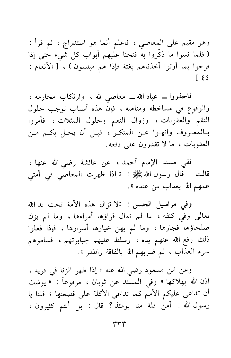 وعن ابن مسعود رضي الله عنه: إذا ظهر الزنى في قرية أذن الله بهلاكها، وفي المسند عن ثوبان، مرفوعا: يوشك أن تداعى عليكم الأمم كما تداعى الأكلة على قصعتها، قلنا: يا رسول الله، أمن قلة منا يومئذ؟ قال: بل أنتم كثيرون،
