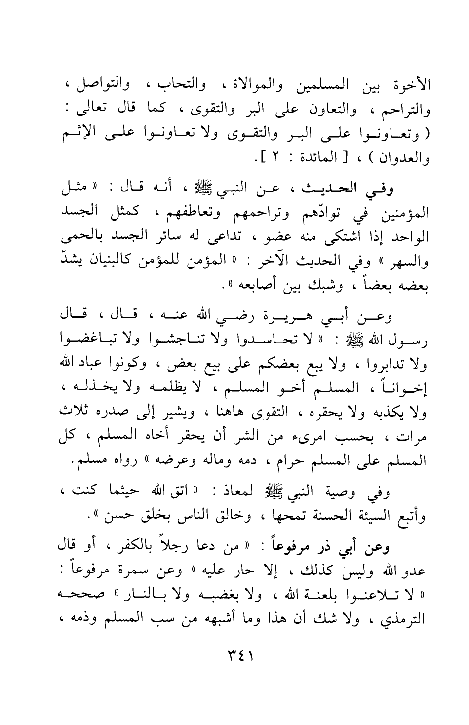 الأخوة بين المسلمين والموالاة، والتحاب، والتواصل، والتراحم، والتعاون على البر والتقوى، كما قال تعالى:: {وَتَعَاوَنُوا عَلَى الْبِرِّ وَالتَّقْوَى وَلا تَعَاوَنُوا عَلَى الأِثْمِ وَالْعُدْوَانِ} [سورة المائدة آية: 2] .