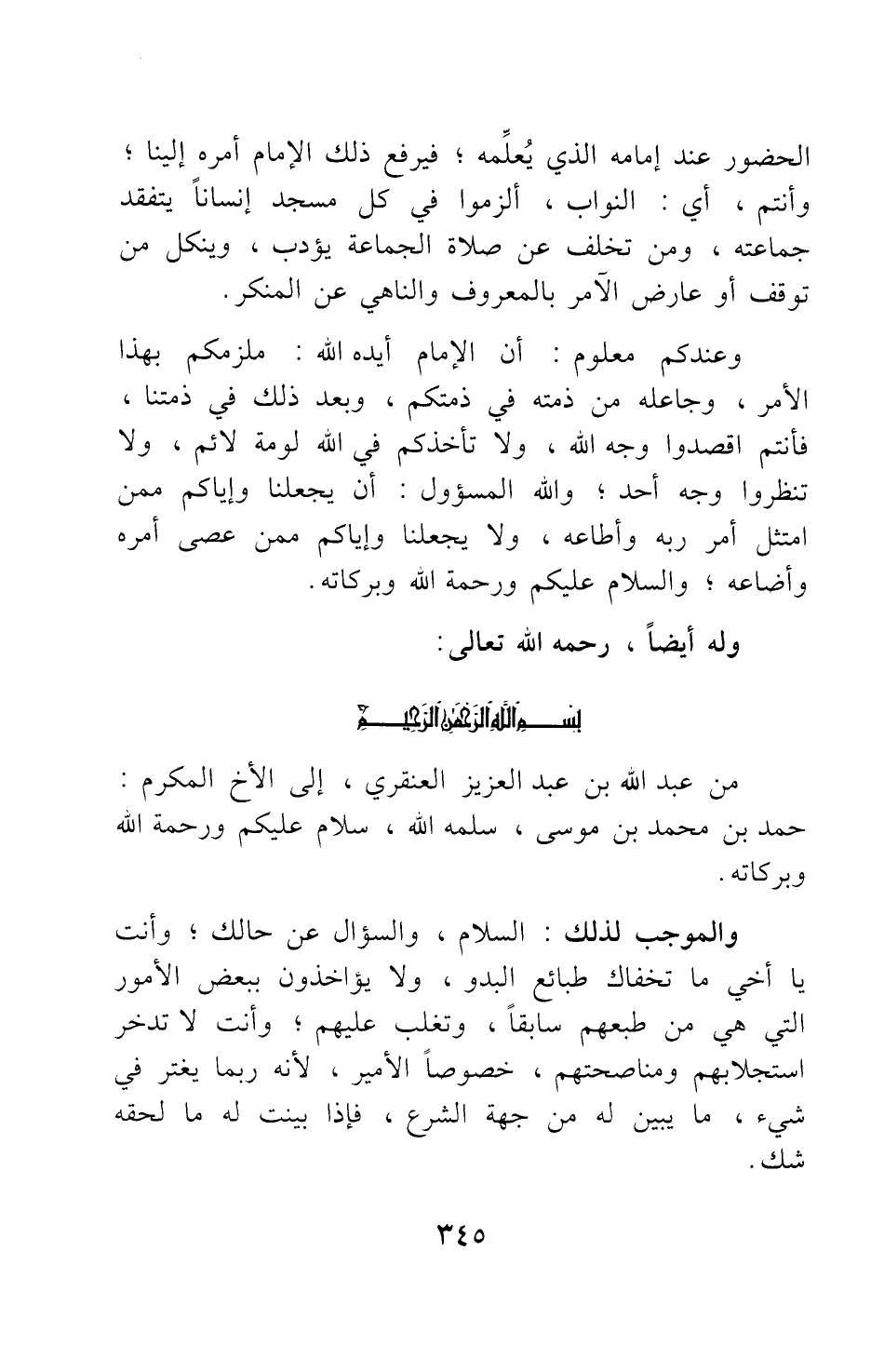 من عبد الله بن عبد العزيز العنقري، إلى الأخ المكرم: حمد بن محمد بن موسى، سلمه الله، سلام عليكم ورحمة الله وبركاته.