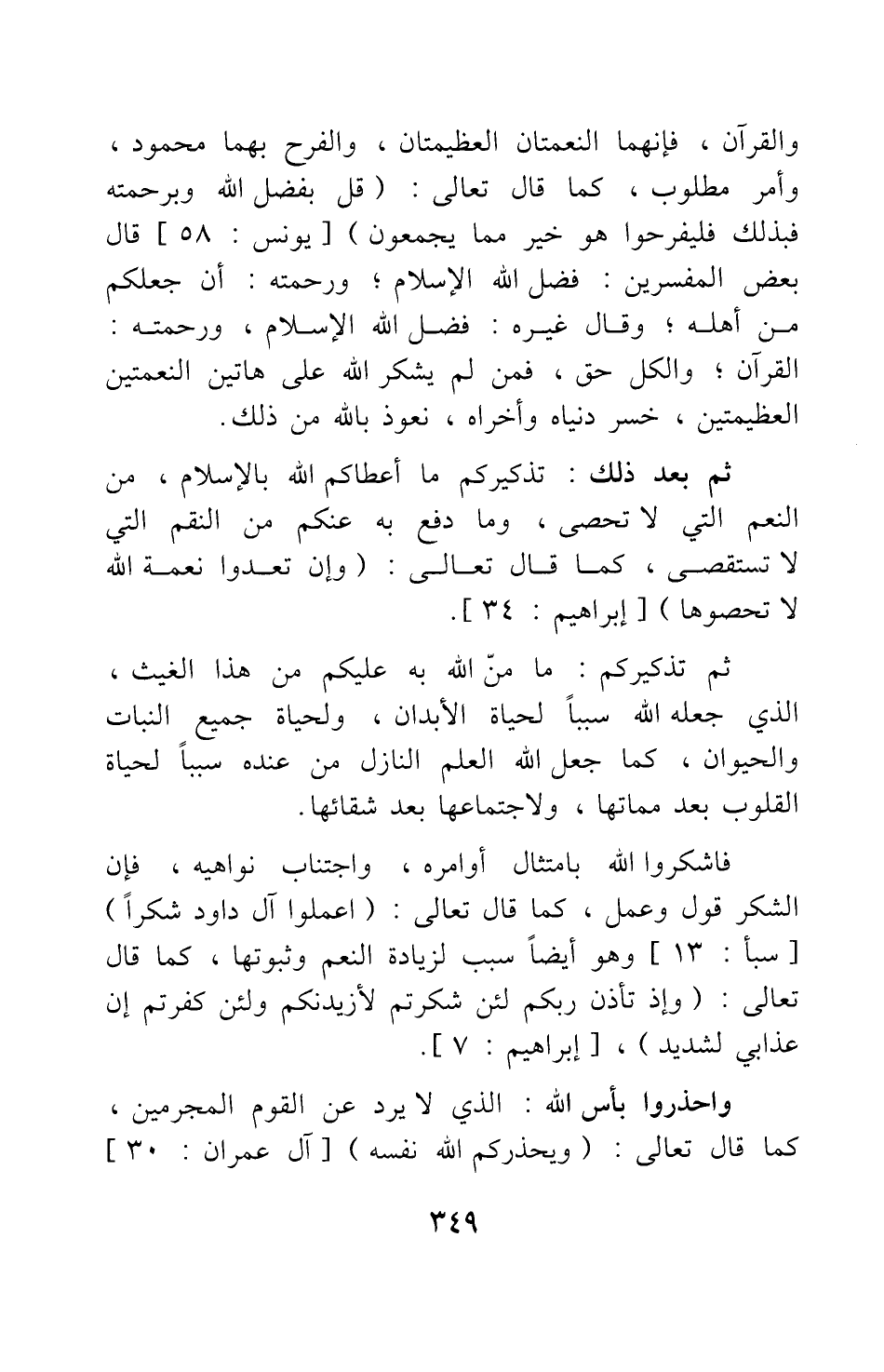 والقرآن، فإنهما النعمتان العظيمتان، والفرح بهما محمود، وأمر مطلوب، كما قال تعالى: {قُلْ بِفَضْلِ اللَّهِ وَبِرَحْمَتِهِ فَبِذَلِكَ فَلْيَفْرَحُوا هُوَ خَيْرٌ مِمَّا يَجْمَعُونَ} [سورة يونس آية: 58] ، قال بعض المفسرين: فضل الله: الإسلام، ورحمته: أن جعلكم من أهله، وقال غيره: فضل الله: الإسلام، ورحمته: القرآن، والكل حق؛ فمن لم يشكر الله على هاتين النعمتين العظيمتين خسر دنياه وأخراه، نعوذ بالله من ذلك.