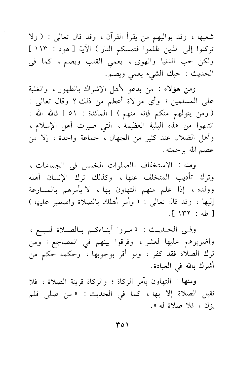 ومنه: الاستخفاف بالصلوات الخمس في الجماعات، وترك تأديب المتخلف عنها، وكذلك ترك الإنسان أهله وولده، إذا علم منهم التهاون بها، لا يأمرهم بالمسارعة إليها، وقد قال تعالى: {وَأْمُرْ أَهْلَكَ بِالصَّلاةِ وَاصْطَبِرْ عَلَيْهَا} [سورة طه آية: 132] .