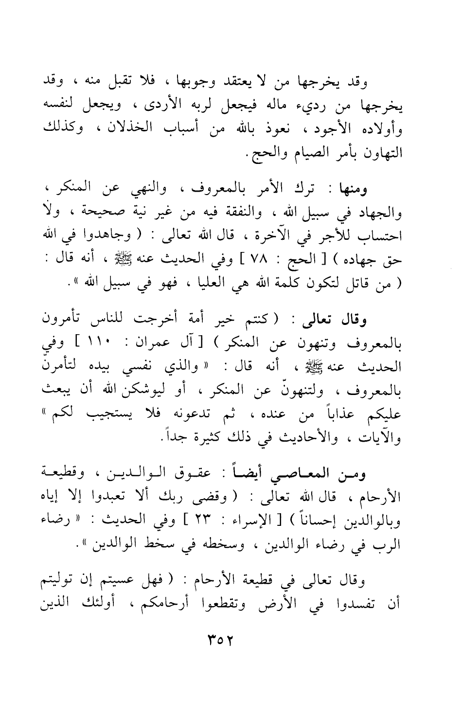 ومنها: ترك الأمر بالمعروف والنهي عن المنكر، والجهاد في سبيل الله، والنفقة فيه من غير نية صحيحة، ولا احتساب للأجر في الآخرة، قال الله تعالى: {وَجَاهِدُوا فِي اللَّهِ حَقَّ جِهَادِهِ} [سورة الحج آية: 78] .