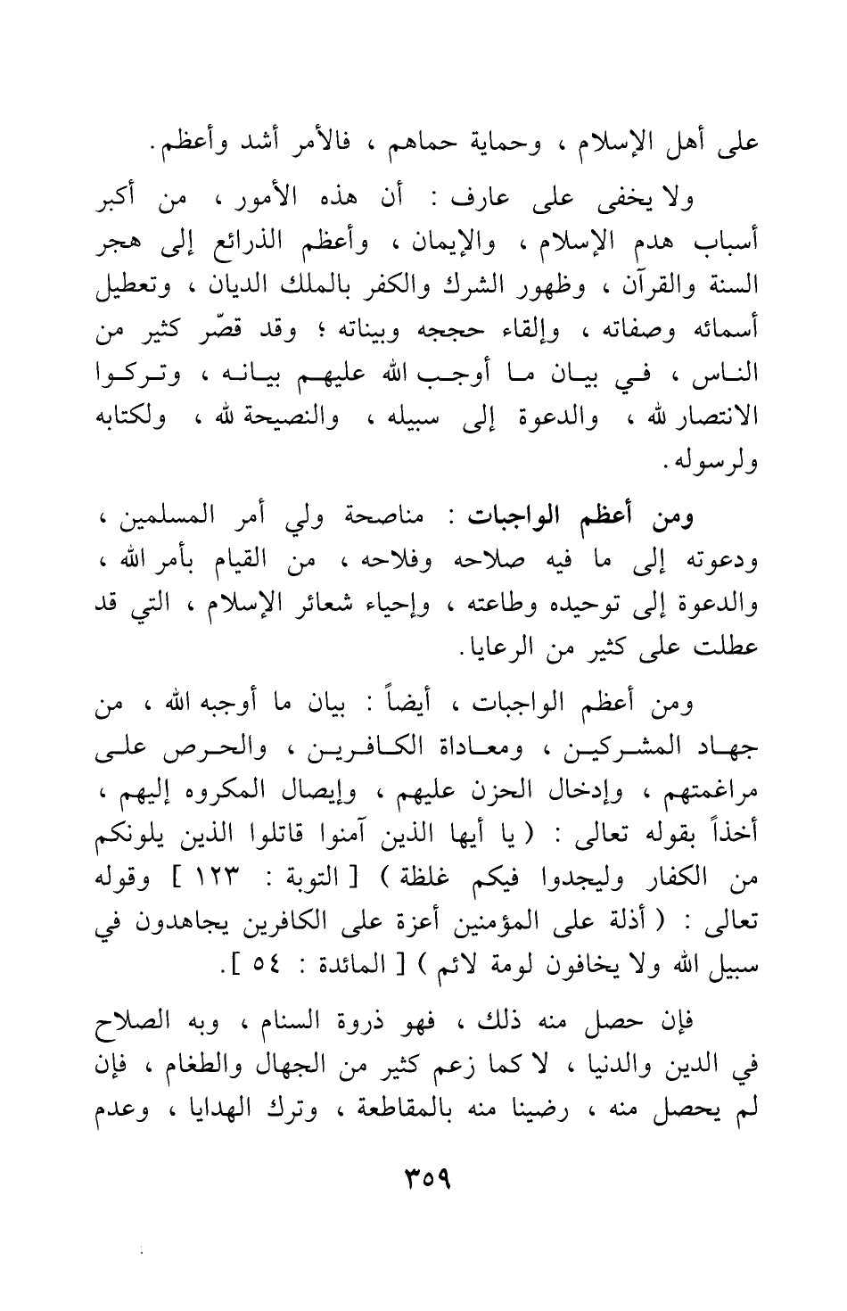 ولا يخفى على عارف أن هذه الأمور من أكبر أسباب هدم الإسلام والإيمان، وأعظم الذرائع إلى هجر السنة والقرآن، وظهور الشرك والكفر بالملك الديان، وتعطيل أسمائه وصفاته، وإلقاء حججه وبيناته. وقد قصر كثير من الناس، في بيان ما أوجب الله عليهم بيانه، وتركوا الانتصار لله، والدعوة إلى سبيله، والنصيحة لله، ولكتابه ولرسوله.
