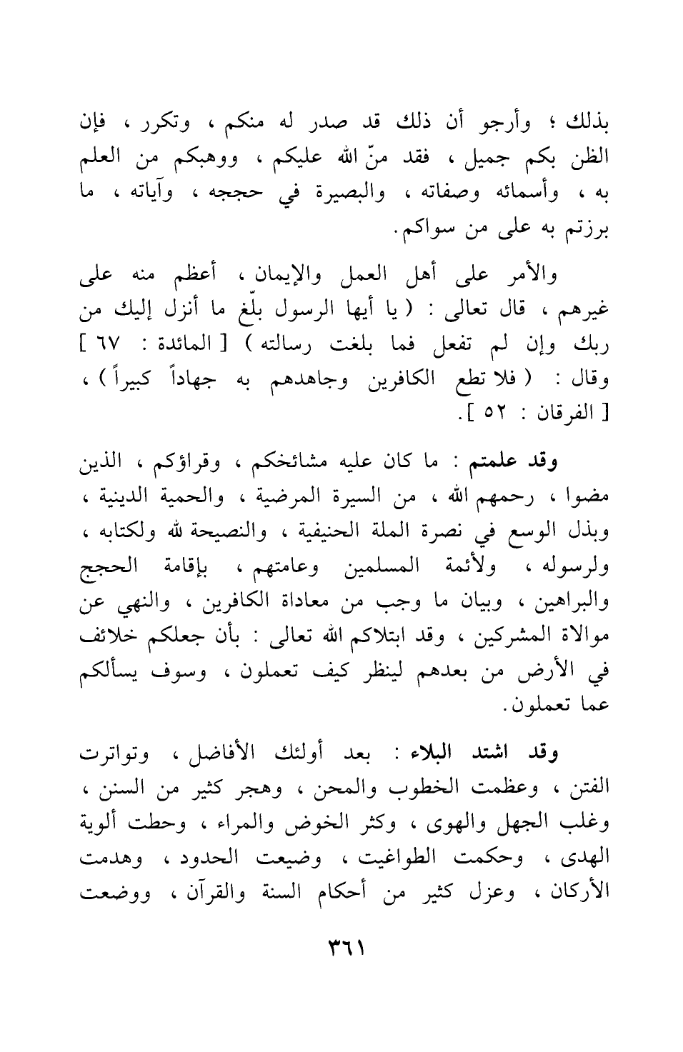 وقد علمتم ما كان عليه مشايخكم وقراؤكم الذين مضوا، رحمهم الله، من السيرة المرضية، والحمية الدينية، وبذل الوسع في نصرة الملة الحنيفية، والنصيحة لله ولكتابه، ولرسوله، ولأئمة المسلمين وعامتهم، بإقامة الحجج والبراهين، وبيان ما وجب من معاداة الكافرين، والنهي عن موالاة المشركين؛ وقد ابتلاكم الله تعالى بأن جعلكم خلائف في الأرض من بعدهم لينظر كيف تعملون، وسوف يسألكم عما تعملون.