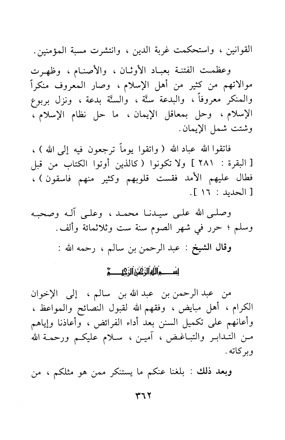 من عبد الرحمن بن عبد الله بن سالم، إلى الإخوان الكرام، أهل مبايض، وفقهم الله لقبول النصائح والمواعظ، وأعانهم على تكميل السنن بعد أداء الفرائض، وأعاذنا وإياهم من التدابر والتباغض، آمين، سلام عليكم ورحمة الله وبركاته.