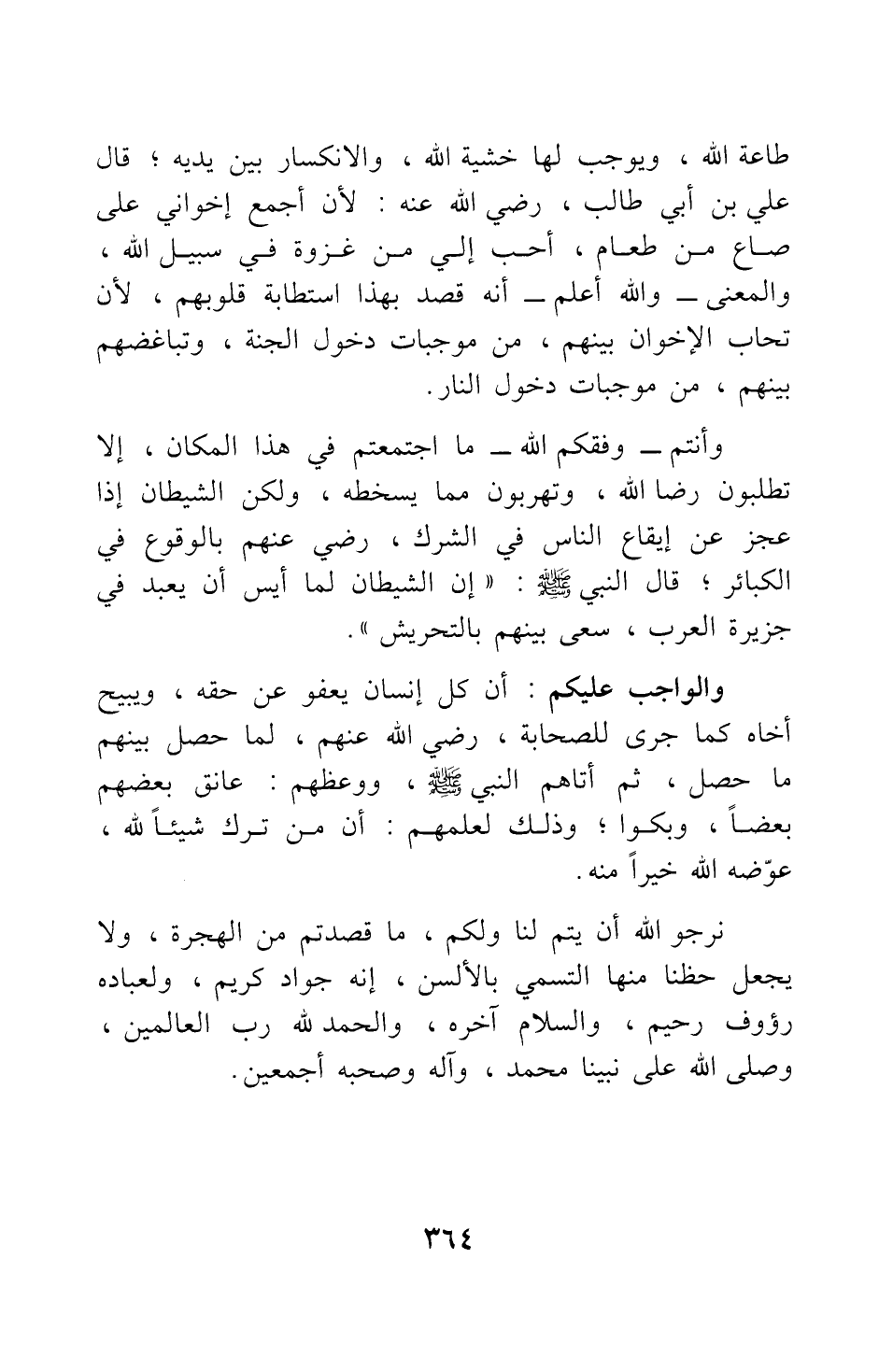 طاعة الله، ويوجب لها خشية الله، والانكسار بين يديه، قال علي بن أبي طالب رضي الله عنه: لأن أجمع إخواني على صاع من طعام، أحب إلي من غزوة في سبيل الله والمعنى- والله أعلم- أنه قصد بهذا استطابة قلوبهم، لأن تحاب الإخوان بينهم من موجبات دخول الجنة، وتباغضهم بينهم من موجبات دخول النار.