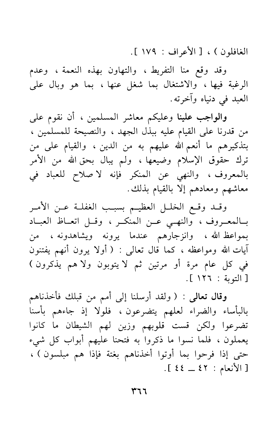 والواجب علينا وعليكم معاشر المسلمين، أن نقوم على من قدرنا على القيام عليه ببذل الجهد، والنصيحة للمسلمين، بتذكيرهم ما أنعم الله عليهم به من الدين، والقيام على من ترك حقوق الإسلام وضيعها، ولم يبال بحق الله من الأمر بالمعروف، والنهي عن المنكر؛ فإنه لا صلاح للعباد في معاشهم ومعادهم إلا بالقيام بذلك.