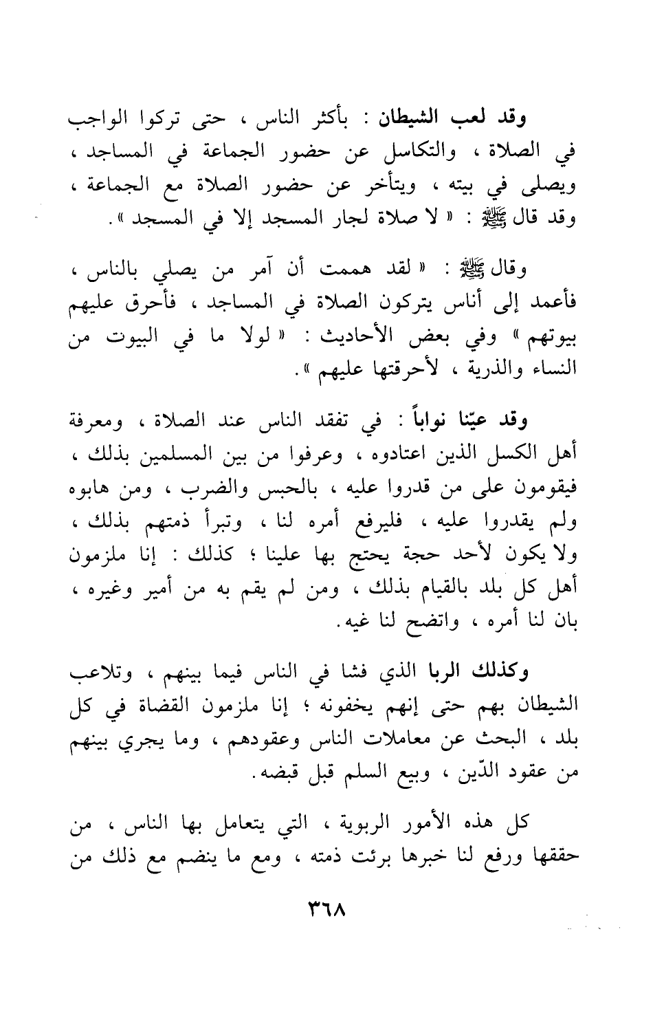 وقد عينا نوابا في تفقد الناس عند الصلاة، ومعرفة أهل الكسل الذين اعتادوه وعرفوا من بين المسلمين بذلك، فيقومون على من قدروا عليه بالحبس والضرب؛ ومن هابوه ولم يقدروا عليه، فليرفع أمره لنا، وتبرأ ذمتهم بذلك، ولا يكون لأحد حجة يحتج بها علينا. كذلك إنا ملزمون أهل كل بلد بالقيام بذلك، ومن لم يقم به من أمير وغيره، بان لنا أمره، واتضح لنا غيه.