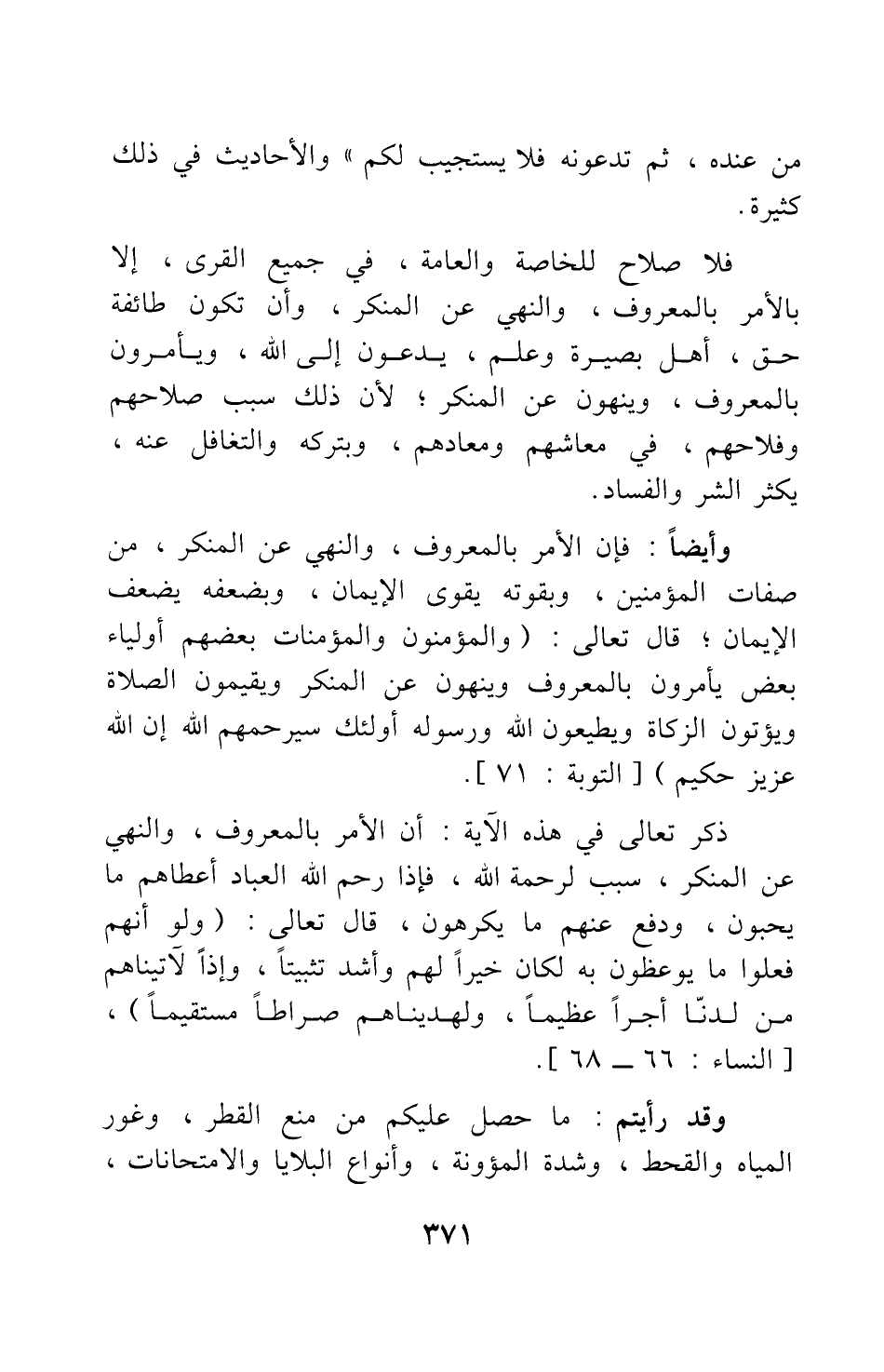 فلا صلاح للخاصة والعامة، في جميع القرى، إلا بالأمر بالمعروف والنهي عن المنكر، وأن تكون طائفة حق، أهل بصيرة وعلم، يدعون إلى الله، ويأمرون بالمعروف، وينهون عن المنكر. لأن ذلك سبب صلاحهم وفلاحهم، في معاشهم ومعادهم؛ وبتركه والتغافل عنه، يكثر الشر والفساد.