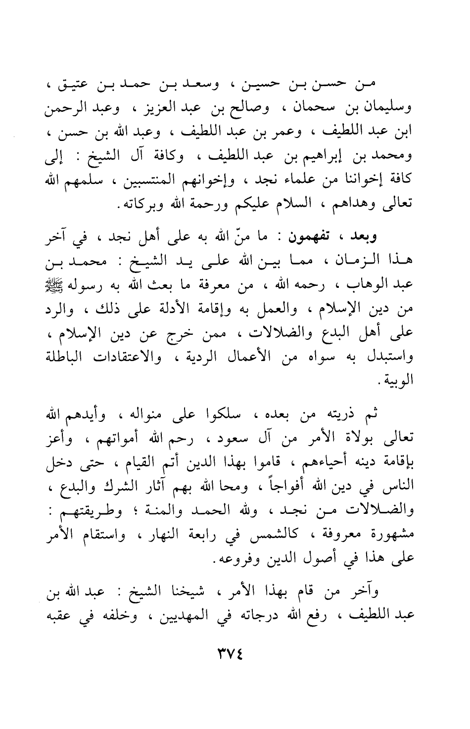 وآخر من قام بهذا الأمر، شيخنا الشيخ: عبد الله بن عبد اللطيف، رفع الله درجاته في المهديين، وخلفه في عقبه