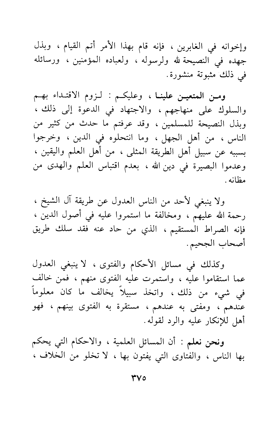 ومن المتعين علينا، وعليكم لزوم الاقتداء بهم والسلوك على منهاجهم، والاجتهاد في الدعوة إلى ذلك، وبذل النصيحة للمسلمين. وقد عرفتم ما حدث من كثير من الناس، من أهل الجهل، وما انتحلوه في الدين، وخرجوا بسببه عن سبيل أهل الطريقة المثلى من أهل العلم واليقين، وعدموا البصيرة في دين الله، بعدم اقتباس العلم والهدى من مظانه.