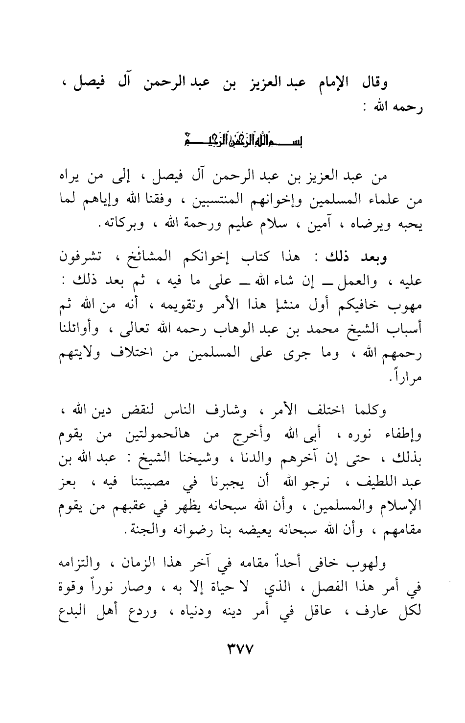 من عبد العزيز بن عبد الرحمن آل فيصل، إلى من يراه من علماء المسلمين وإخوانهم المنتسبين، وفقنا الله وإياهم لما يحبه ويرضاه، آمين، سلام عليكم ورحمة الله، وبركاته.