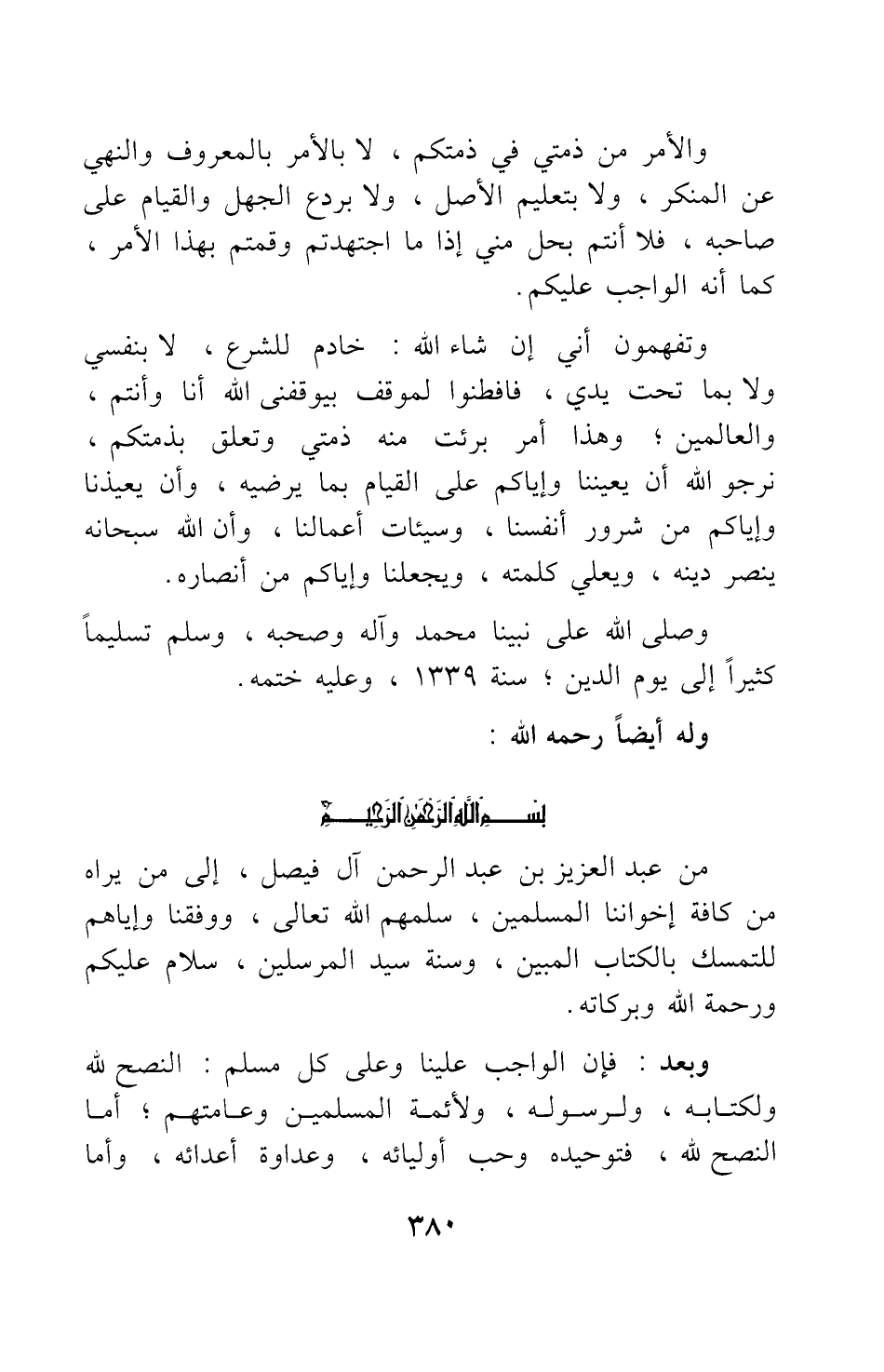 من عبد العزيز بن عبد الرحمن آل فيصل، إلى من يراه من كافة إخواننا المسلمين، سلمهم الله تعالى، ووفقنا وإياهم للتمسك بالكتاب المبين، وسنة سيد المرسلين، سلام عليكم ورحمة الله وبركاته.