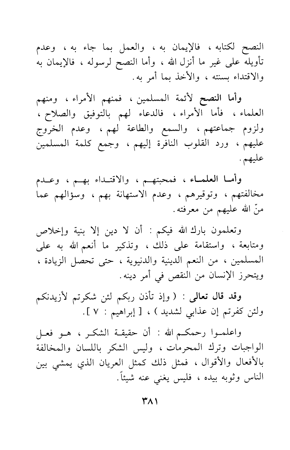 واعلموا رحمكم الله أن حقيقة الشكر هو فعل الواجبات وترك المحرمات، وليس الشكر باللسان والمخالفة بالأفعال والأقوال؛ فمثل ذلك كمثل العريان الذي يمشي بين الناس وثوبه بيده، فليس يغني عنه شيئا.