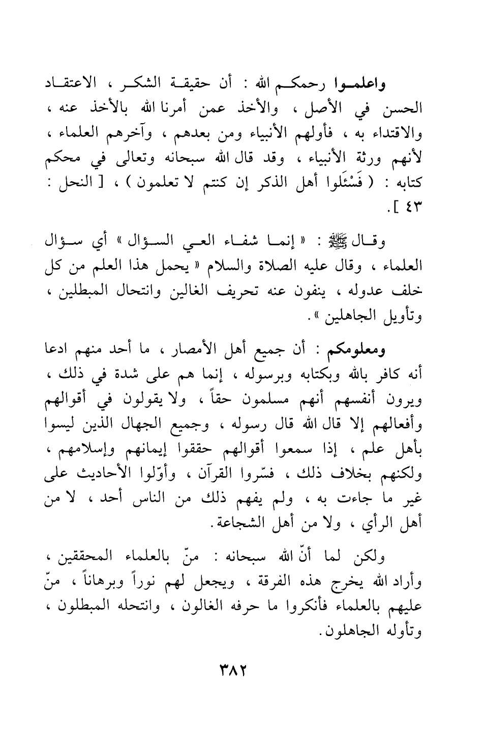 واعلموا رحمكم الله أن حقيقة الشكر، الاعتقاد الحسن في الأصل، والأخذ عمن أمرنا الله بالأخذ عنه، والاقتداء به، فأولهم الأنبياء ومن بعدهم، وآخرهم العلماء، لأنهم ورثة الأنبياء، وقد قال الله سبحانه وتعالى في محكم كتابه: {فَاسْأَلوا أَهْلَ الذِّكْرِ إِنْ كُنْتُمْ لا تَعْلَمُونَ} [سورة النحل آية: 43] .