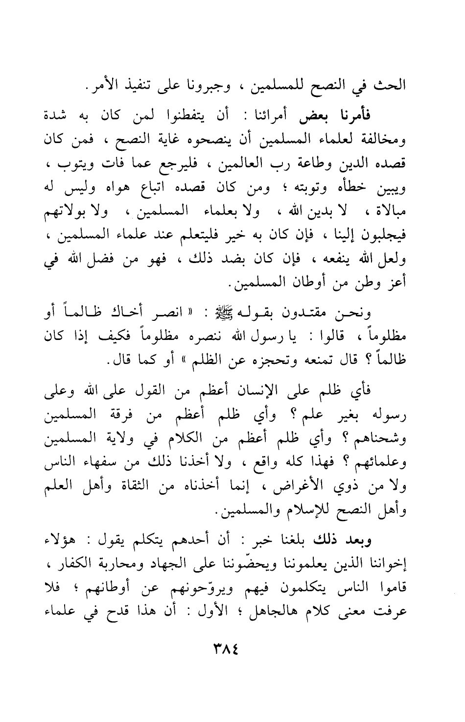 فأمرنا بعض أمرائنا أن يفطنوا لمن كان به شدة ومخالفة لعلماء المسلمين أن ينصحوه غاية النصح، فمن كان قصده الدين وطاعة رب العالمين، فليرجع عما فات ويتوب، ويبين خطأه وتوبته؛ ومن كان قصده اتباع هواه وليس له مبالاة، لا بدين الله، ولا بعلماء المسلمين، ولا بولاتهم فيجلبون إلينا؛ فإن كان به خير فليتعلم عند علماء المسلمين، ولعل الله ينفعه، فإن كال بضد ذلك، فهو من فضل الله في أعز وطن من أوطان المسلمين.