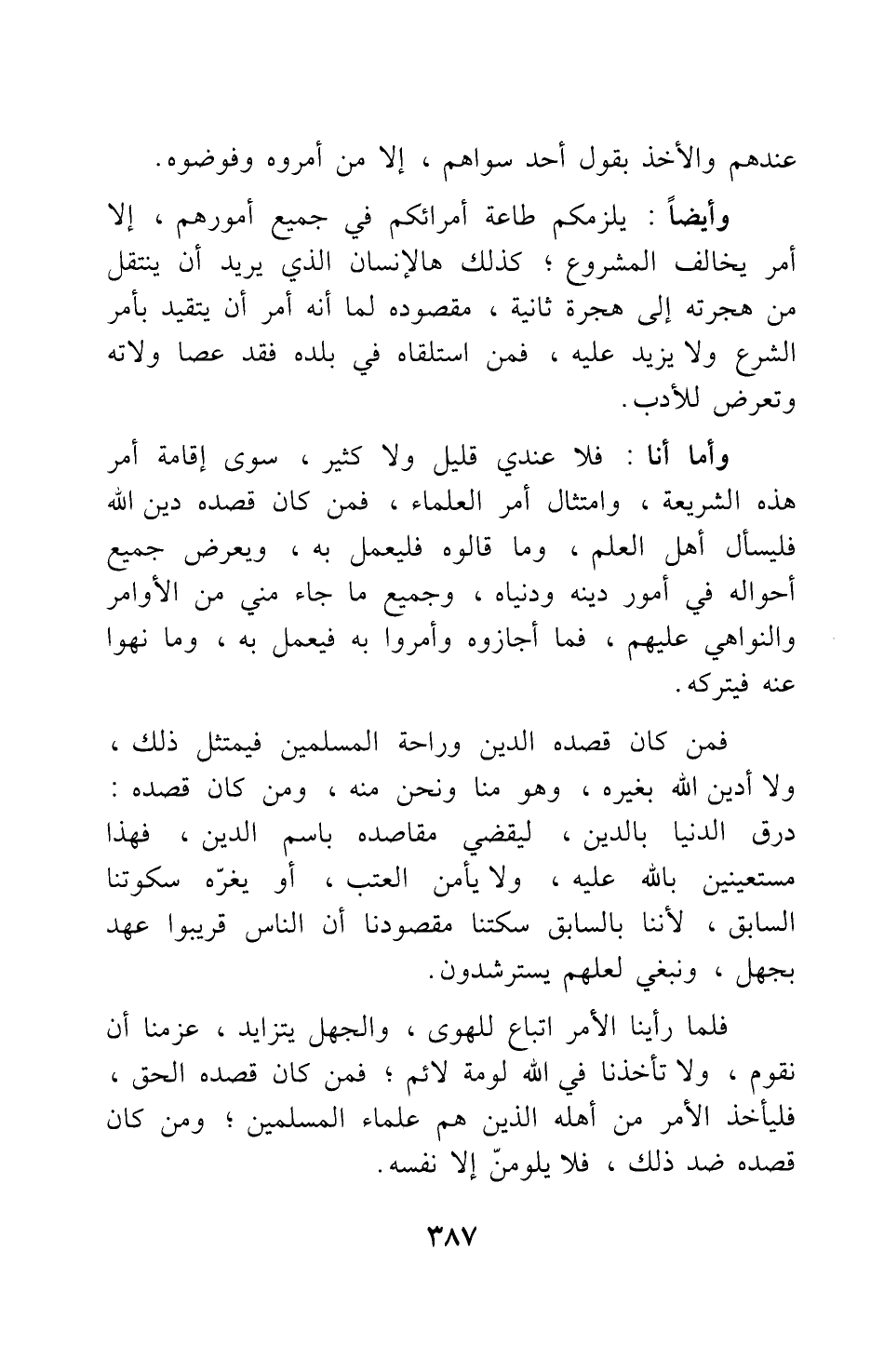وأما أنا فلا عندي قليل ولا كثير، سوى إقامة أمر هذه الشريعة، وامتثال أمر العلماء؛ فمن كان قصده دين الله فليسأل أهل العلم، وما قالوه فليعمل به، ويعرض جميع أحواله في أمور دينه ودنياه، وجميع ما جاء مني من الأوامر والنواهي عليهم، فما أجازوه وأمروا به فيعمل به، وما نهوا عنه فيتركه.