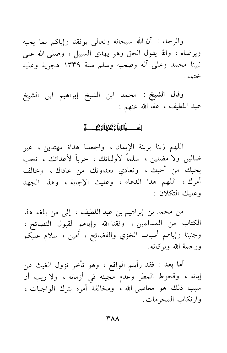 من محمد بن إبراهيم بن عبد اللطيف، إلى من بلغه هذا الكتاب من المسلمين، وفقنا الله وإياهم لقبول النصائح، وجنبنا وإياهم أسباب الخزي والفضائح، آمين. سلام عليكم ورحمة الله وبركاته.