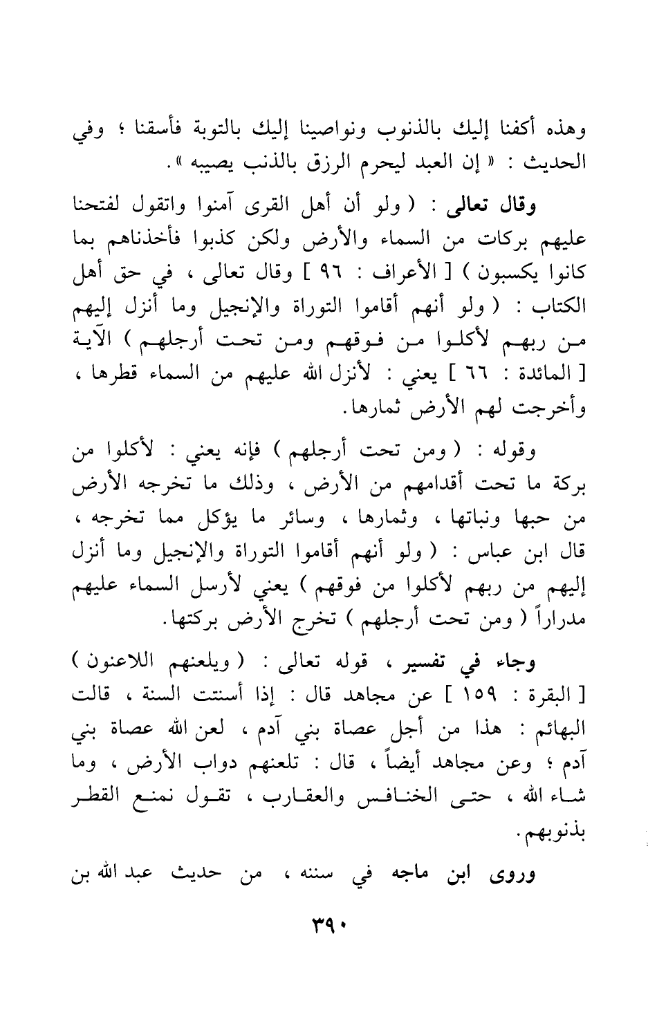 وقال تعالى في حق أهل الكتاب: {وَلَوْ أَنَّهُمْ أَقَامُوا التَّوْرَاةَ وَالأِنْجِيلَ وَمَا أُنْزِلَ إِلَيْهِمْ مِنْ رَبِّهِمْ لأَكَلُوا مِنْ فَوْقِهِمْ وَمِنْ تَحْتِ أَرْجُلِهِمْ} الآية [سورة المائدة آية: 66] ، يعني: لأنزل الله عليهم من السماء قطرها، وأخرجت لهم الأرض ثمارها.