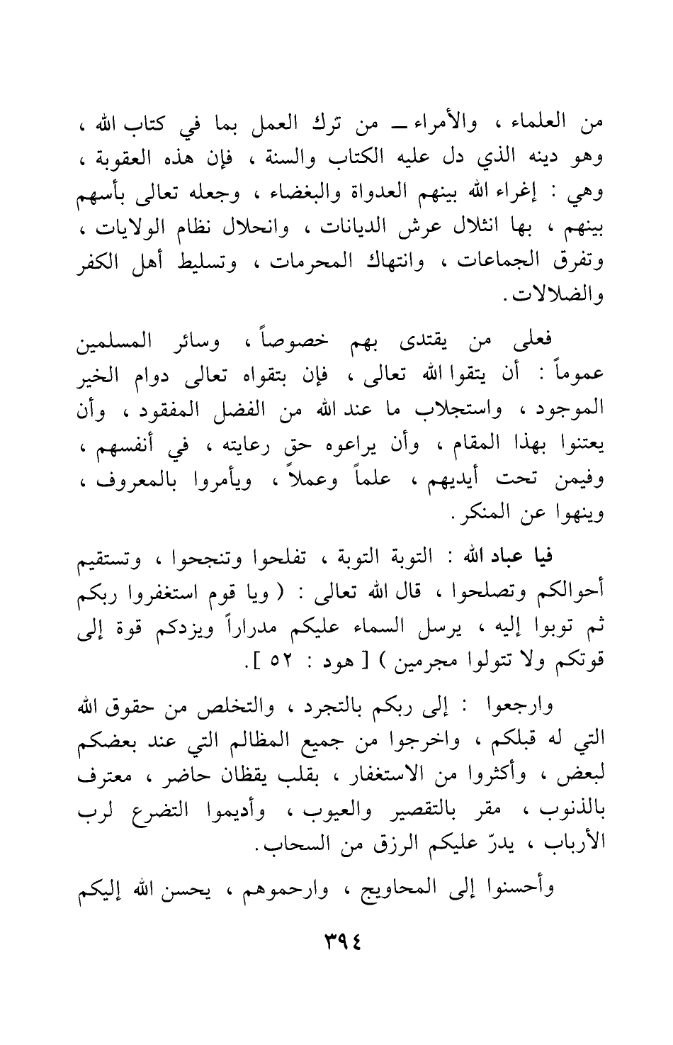 فعلى من يقتدى بهم خصوصا، وسائر المسلمين عموما أن يتقوا الله تعالى، فإن بتقواه تعالى دوام الخير الموجود، واستجلاب ما عند الله من الفضل المفقود، وأن يعتنوا بهذا المقام، وأن يراعوه حق رعايته، في أنفسهم، وفيمن تحت أيديهم، علما وعملا، ويأمروا بالمعروف، وينهوا عن المنكر. فيا عباد الله: التوبة التوبة! تفلحوا وتنجحوا، وتستقيم أحوالكم وتصلحوا، قال الله تعالى: {وَيَا قَوْمِ اسْتَغْفِرُوا رَبَّكُمْ ثُمَّ تُوبُوا إِلَيْهِ يُرْسِلِ السَّمَاءَ عَلَيْكُمْ مِدْرَاراً وَيَزِدْكُمْ قُوَّةً إِلَى قُوَّتِكُمْ وَلا تَتَوَلَّوْا مُجْرِمِينَ} [سورة هود آية: 52] .