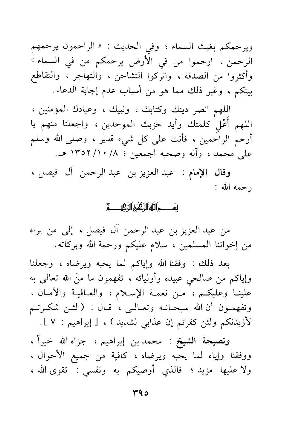 من عبد العزيز بن عبد الرحمن آل فيصل، إلى من يراه من إخواننا المسلمين، سلام عليكم ورحمة الله وبركاته.