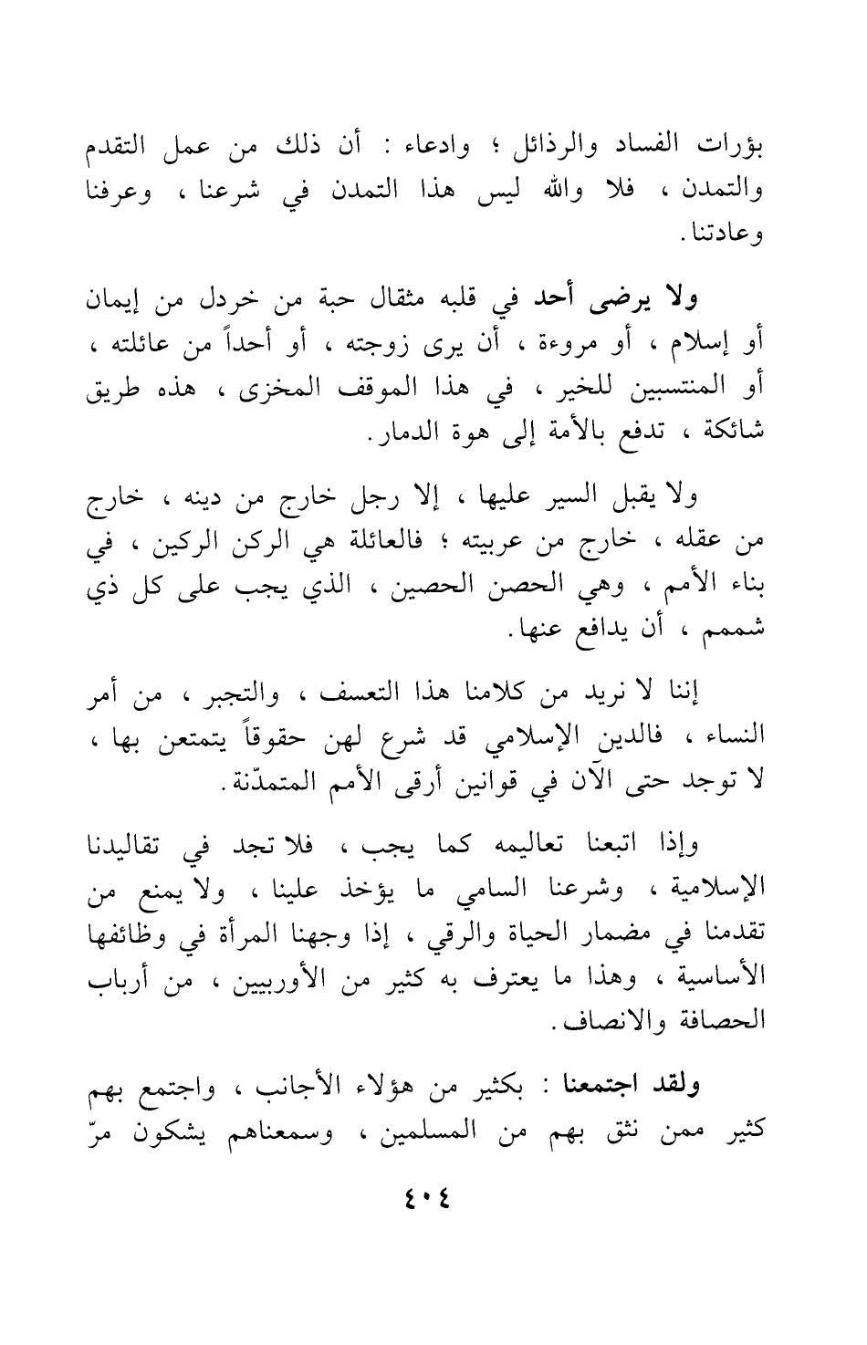 وإذا اتبعنا تعاليمه كما يجب، فلا تجد في تقاليدنا الإسلامية وشرعنا السامي ما يؤخذ علينا، ولا يمنع من تقدمنا في مضمار الحياة والرقي، إذا وجهنا المرأة في وظائفها الأساسية؛ وهذا ما يعترف به كثير من الأوربيين من أرباب الحصافة والإنصاف.