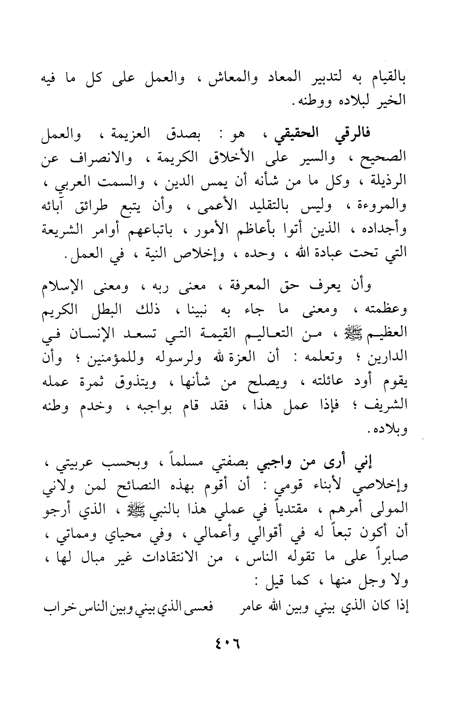 إني أرى من واجبي بصفتي مسلما، وبحسب عربيتي وإخلاصي لأبناء قومي، أن أقوم بهذه النصائح لمن ولاني المولى أمرهم، مقتديا في عملي هذا بالنبي صلى الله عليه وسلم الذي أرجو أن أكون تبعا له في أقوالي وأعمالي، وفي محياي ومماتي، صابرا على ما تقوله الناس من الانتقادات غير مبال لها ولا وجل منها، كما قيل: