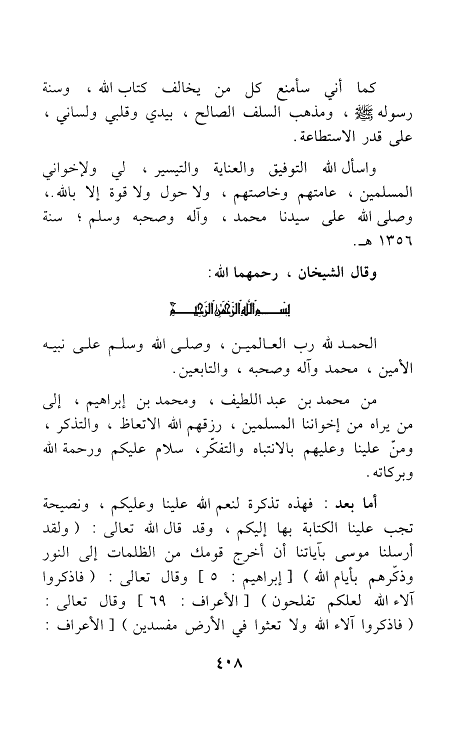 من محمد بن عبد اللطيف، ومحمد بن إبراهيم، إلى من يراه من إخواننا المسلمين، رزقهم الله الاتعاظ والتذكر، ومنّ علينا وعليهم بالانتباه والتفكر، سلام عليكم ورحمة الله وبركاته.