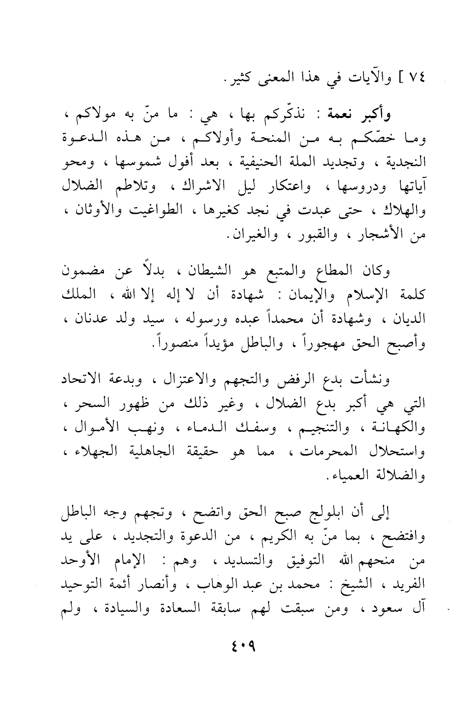 وأكبر نعمة نذكّركم بها، هي: ما منّ به مولاكم، وما خصكم به من المنحة وأولاكم، من هذه الدعوة النجدية، وتجديد الملة الحنيفية، بعد أفول شموسها، ومحو آياتها ودروسها، واعتكار ليل الإشراك، وتلاطم الضلال والهلاك، حتى عبدت في نجد كغيرها، الطواغيت والأوثان، من الأشجار والقبور والغيران.