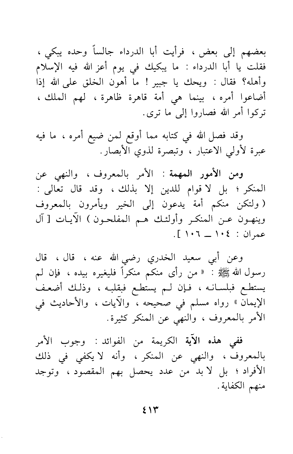 ومن الأمور المهمة: الأمر بالمعروف، والنهي عن المنكر ; بل لا قوام للدين إلا بذلك، وقد قال تعالى: {وَلْتَكُنْ مِنْكُمْ أُمَّةٌ يَدْعُونَ إِلَى الْخَيْرِ وَيَأْمُرُونَ بِالْمَعْرُوفِ وَيَنْهَوْنَ عَنِ الْمُنْكَرِ وَأُولَئِكَ هُمُ الْمُفْلِحُونَ} الآيات سورة [آل عمران آية: 104] .