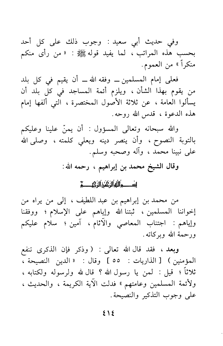 من محمد بن إبراهيم بن عبد اللطيف، إلى من يراه من إخواننا المسلمين، ثبتنا الله وإياهم على الإسلام; ووفقنا وإياهم: اجتناب المعاصي والآثام، آمين، سلام عليكم ورحمة الله وبركاته.