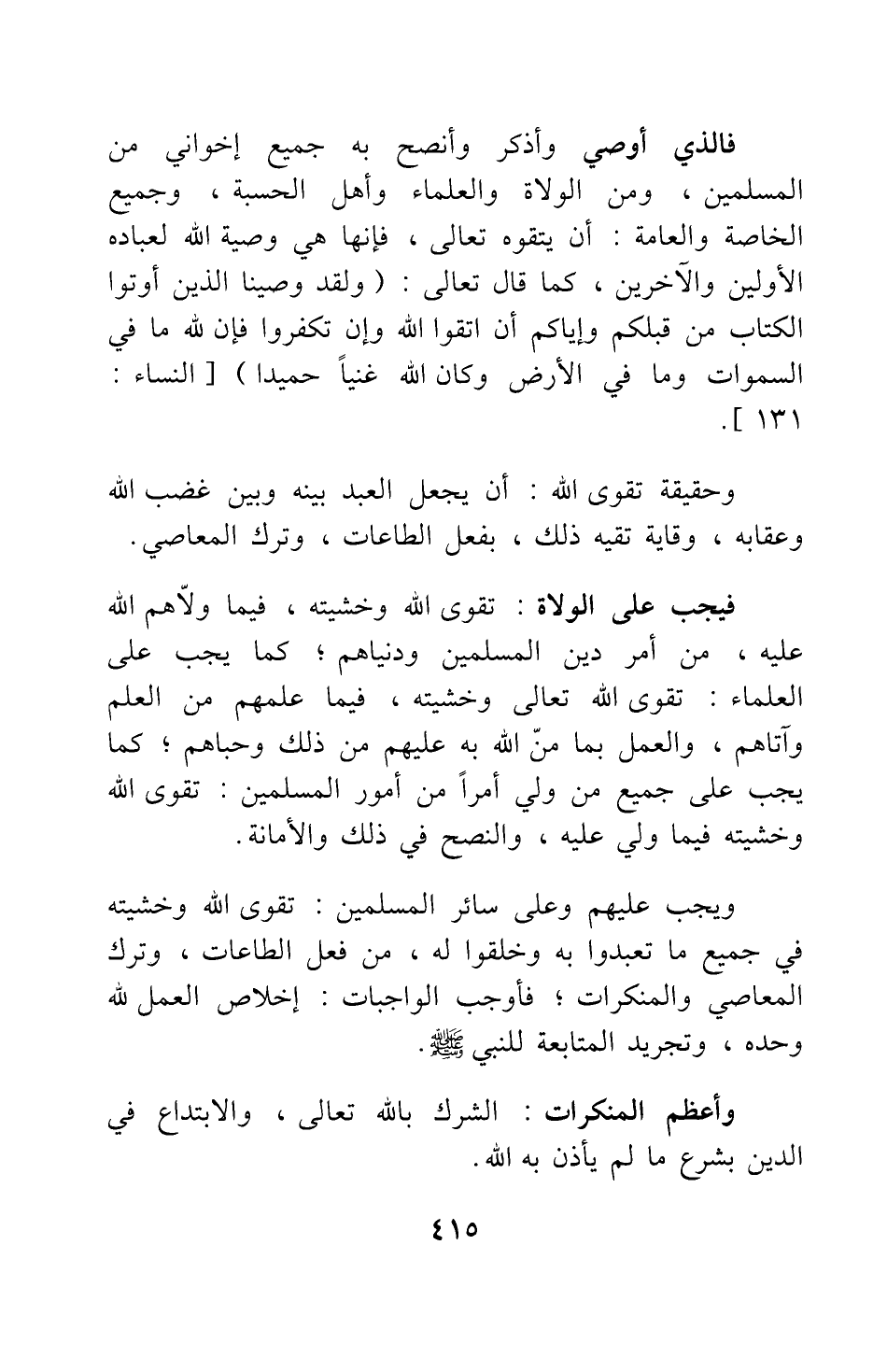 فالذي أوصي وأذكر وأنصح به جميع إخواني من المسلمين، ومن الولاة والعلماء وأهل الحسبة، وجميع الخاصة والعامة: أن يتقوه تعالى، فإنها هي وصية الله لعباده الأولين والآخرين، كما قال تعالى: {وَلَقَدْ وَصَّيْنَا الَّذِينَ أُوتُوا الْكِتَابَ مِنْ قَبْلِكُمْ وَإِيَّاكُمْ أَنِ اتَّقُوا اللَّهَ وَإِنْ تَكْفُرُوا فَإِنَّ لِلَّهِ مَا فِي السَّمَاوَاتِ وَمَا فِي الأَرْضِ وَكَانَ اللَّهُ غَنِيّاً حَمِيداً} [سورة النساء آية: 131] .