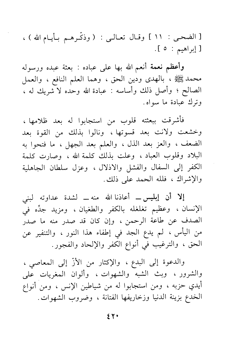 وأعظم نعمة أنعم الله بها على عباده: بعثة عبده ورسوله محمد صلى الله عليه وسلم بالهدى ودين الحق، وهما العلم النافع، والعمل الصالح; وأصل ذلك وأساسه: عبادة الله وحده لا شريك له، وترك عبادة ما سواه.