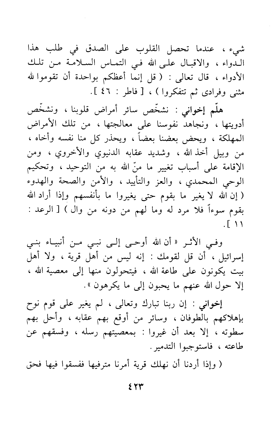 هلّم إخواني نشخّص سائر أمراض قلوبنا، ونشخّص أدويتها، ونجاهد نفوسنا على معالجتها، من تلك الأمراض المهلكة، ويحض بعضنا بعضا، ويحذر كل منا نفسه وأخاه، من وبيل أخذ الله، وشديد عقابه الدنيوي والأخروي، ومن الإقامة على أسباب تغيير ما منّ الله به من التوحيد، وتحكيم الوحي المحمدي، والعز والتأييد، والأمن والصحة والهدوء: {إِنَّ اللَّهَ لا يُغَيِّرُ مَا بِقَوْمٍ حَتَّى يُغَيِّرُوا مَا بِأَنْفُسِهِمْ وَإِذَا أَرَادَ اللَّهُ بِقَوْمٍ سُوءاً فَلا مَرَدَّ لَهُ وَمَا لَهُمْ مِنْ دُونِهِ مِنْ وَالٍ [سورة الرعد آية: 11] .