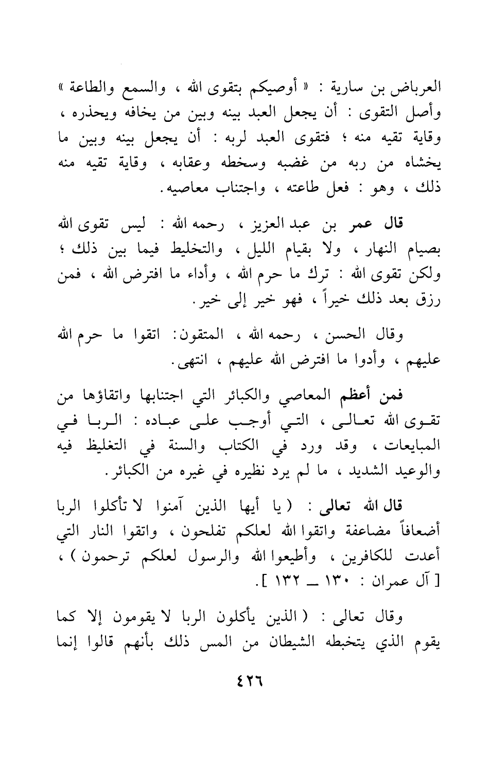 قال الله تعالى: {يَا أَيُّهَا الَّذِينَ آمَنُوا لا تَأْكُلُوا الرِّبا أَضْعَافاً مُضَاعَفَةً وَاتَّقُوا اللَّهَ لَعَلَّكُمْ تُفْلِحُونَ وَاتَّقُوا النَّارَ الَّتِي أُعِدَّتْ لِلْكَافِرِينَ وَأَطِيعُوا اللَّهَ وَالرَّسُولَ لَعَلَّكُمْ تُرْحَمُونَ} [سورة آل عمران آية: 130-132] .