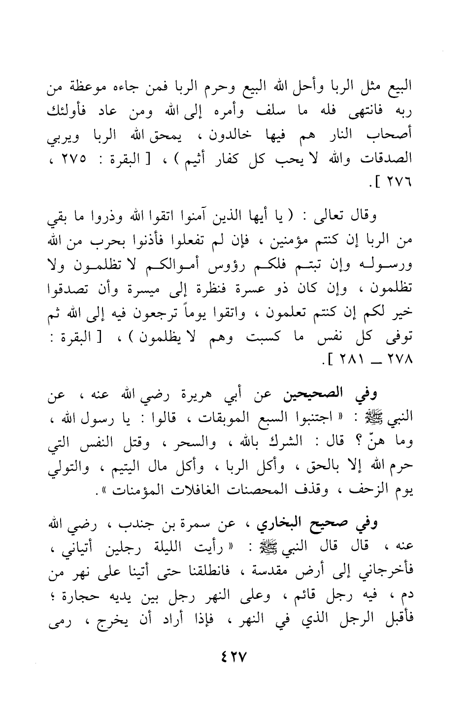 الْبَيْعُ مِثْلُ الرِّبا وَأَحَلَّ اللَّهُ الْبَيْعَ وَحَرَّمَ الرِّبا فَمَنْ جَاءَهُ مَوْعِظَةٌ مِنْ رَبِّهِ فَانْتَهَى فَلَهُ مَا سَلَفَ وَأَمْرُهُ إِلَى اللَّهِ وَمَنْ عَادَ فَأُولَئِكَ أَصْحَابُ النَّارِ هُمْ فِيهَا خَالِدُونَ يَمْحَقُ اللَّهُ الرِّبا وَيُرْبِي الصَّدَقَاتِ وَاللَّهُ لا يُحِبُّ كُلَّ كَفَّارٍ أَثِيمٍ} [سورة البقرة آية: 275-276] .